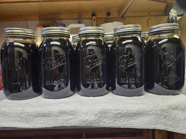 I have quart jars of homemade black walnut stain for sale, $10 each. the only ingredients in this stain are water, walnut husks and 1 tablespoon of vinegar per jar to keep it from molding. Boiled for approximately 2 1/2 hours this is some really good stain without all the extra chemicals. Strained through 4 layers of cheesecloth to remove as many particles as possible. Trust me, it will stain anything it touches including you. Must be picked up locally, I cannot ship it. The wood in the pictures was done with one pass and a really cheap brush to give you an idea of the color, 24 hours drying time. Oak on the top, black walnut in the middle and honey locust on the bottom. The stain is thin because I did not add any thickening agent such as gum arabic powder, and it soaks in right away. more coats will make it darker.