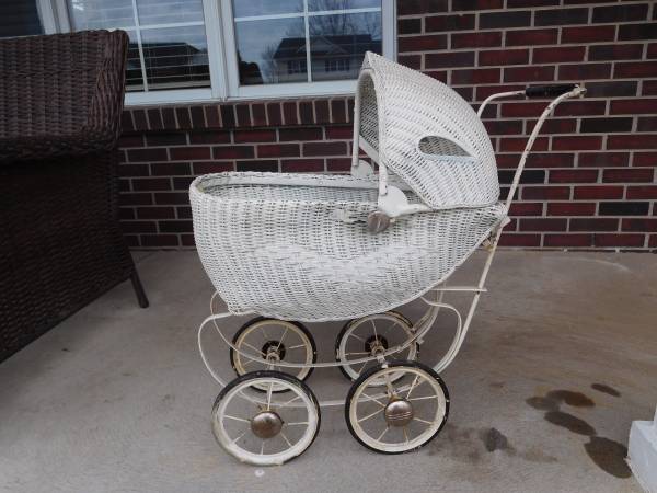 Antique White Wicker Doll Buggy in great condition. Includes inside pillow/mattress in the bottom.