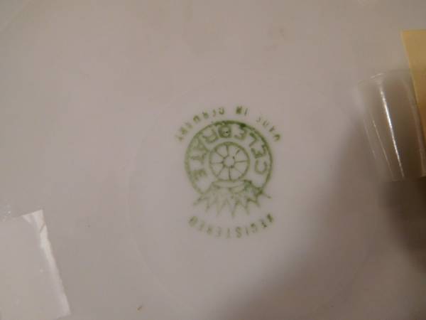 9 1/2 inches in diameter with blue and yellow lines, purple and yellow flowers and green and rust leaves. Excellent condition. Dated in the 1920s.