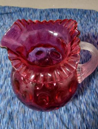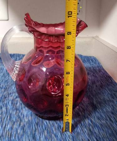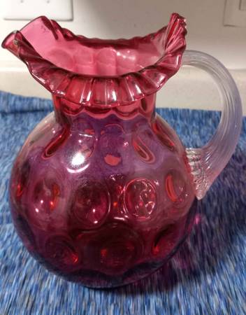 A big cranberry fenton pitcher probably midcentury. Has an internal crack on the base.
