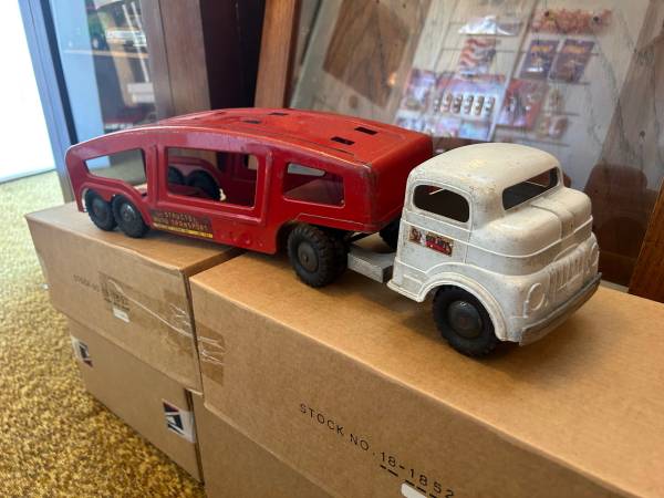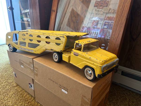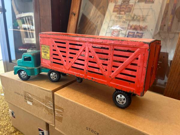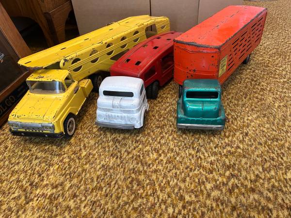 For sale: two 1950’s Structo semi’s one is an auto transport and the other is a cattle farms truck, also one 1961 Tonka auto transport. All been played with but very good condition for age. Need $75 each or all for $175. Also have many more old 50’s -60’s Tonka, Structo, Nylint, and Buddy L trucks that I would sell, need to get rid of a few, running out of room. Please call or text only at show contact info