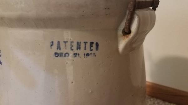 THIS IS AN OLD REDWING UNION STONEWARE CO. 4 GALLON BUTTER CHURN. IT HAS THE SMALL RED WING, WHICH IS VERY RARE. IT HAS THE ORIGINAL WIRE HANDLES AND COMES WITH A LID (MOST WERE BROKEN) AND AN OLD DASHER WHICH LOOKS OF THE SAME TIME PERIOD. IT IS MARKED "PATENTED DEC 21, 1915".