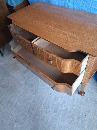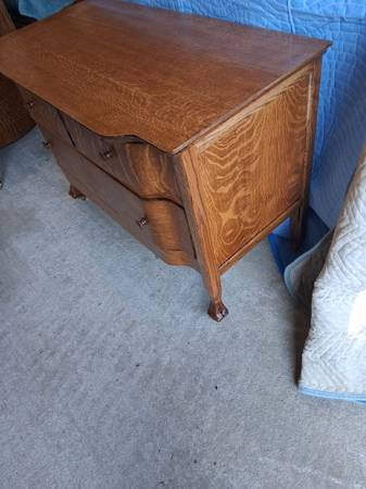 Refinished oak dresser. 3 drawers, hardwood casters. Early American stain color, 3 coats of polyurethane finish.