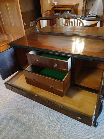 Walnut buffet dated Oct.3, 1928. 3 drawers, 2 doors Hardwood casters New mirror - removable for transport Mirror 11" tall