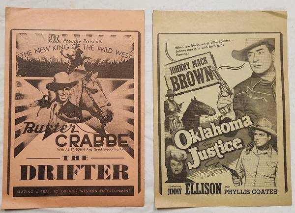 1944 'The Drifter" Buster Crabbe. 1951 'Oklahoma Justice' Johnny Mack Brown. Both are 13 /12× 9 1/2. In good condition but showing some natural aging. $150 Cash on pickup.