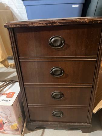 Vintage sewing cabinet with vintage contents (thread, needles, pin cushions, buttons)