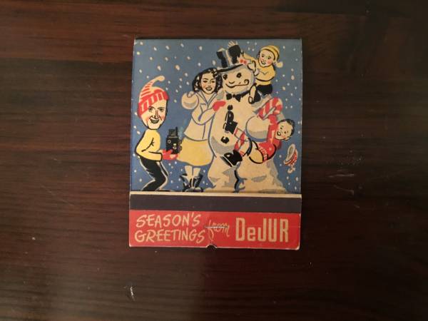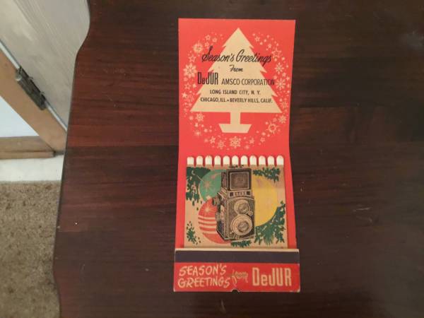 Vintage Seasons’s Greetings match book from DeJur cameras, 1940’s. Amsco Corporation: Long Island City, N.Y. Chicago, Ill and and Beverly Hills, Calif. Measures 4.25” tall and 3.3/8” wide. Cover with bright graphics and minimal wear. One match tip broken off. Unused.
