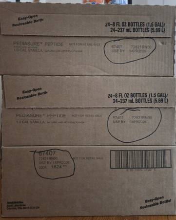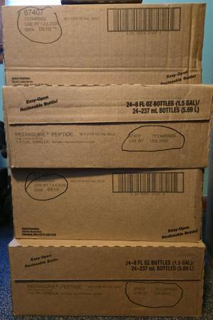 We have 7 sealed boxes of Pediasure Peptide Formula. Each box has 24 8 oz. bottles. This blend amounts to 1 calorie per milliliter and is the vanilla flavored version. Our son was prescribed this formula before recently switching to a different type and unfortunately got these right before the switch. We would like to just make back part of what was spent so we can put it towards the new type of food our son needs. Thankfully the new food is cheaper so we don't need to charge full price for these.