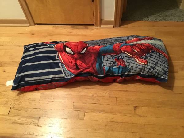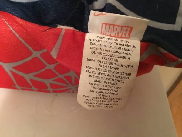 Spider Man body pillow by Marvel. (Not for children under 3 years of age). Measures 48” x 20”. Surface clean only. 100% polyester exterior and fill. Filled, sewn and finished in USA with shell made in China. Small hole on back needs patching. Two stains.