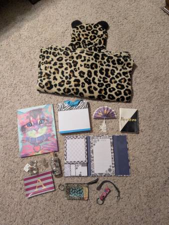 This lot would make a great gift for any young girl! A cat hooded leopard print blanket, 8x10 cat canvas, notepads, a jewelry / coin tray, Vera Bradley small wallet and Vera Bradley keychain. All...