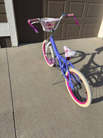 16” Kids bike with basket and kick stand. Good shape. Rear brakes on pedals and front brakes on handle bars. Has grown out of it.