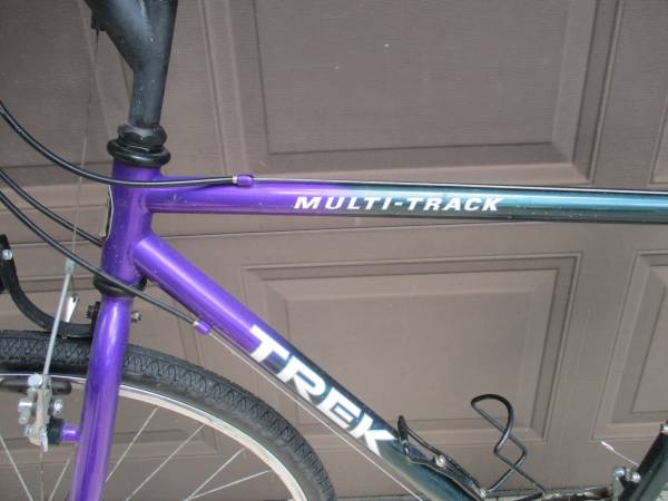 This vintage Trek 21 Speed Multitrack 720 Eco Moly City Bike is a rare find for bike enthusiasts. With its 700C wheel size and Bontrager Select Invert tires, it's perfect for cruising around town or commuting to work. The bike has a large frame size and comes with a riser bar, grip shifter, cantilever brakes, and a Bontrager Seat.