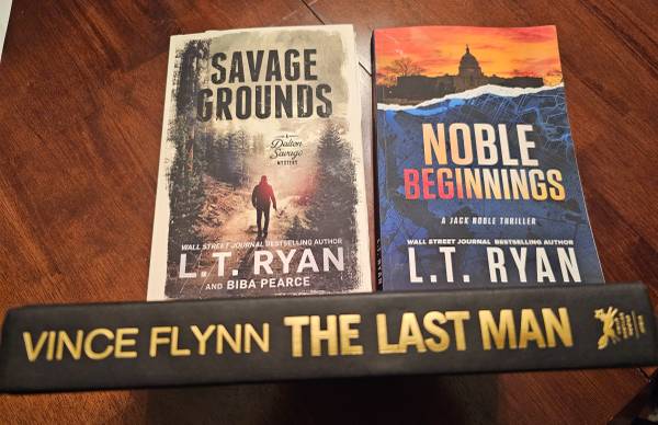 There are five books, four of which are softcovers and one is a hardcover. Two are by author L.T. Ryan: Noble Beginnings and Savage Grounds. One is by Vince Flynn: The Last Man. One is by James Patterson: The Murder Inn. One is by Jack Slater: Dark State All books are in good condition; Savage Grounds has one loose page. Cash only. Sold as is, no returns.