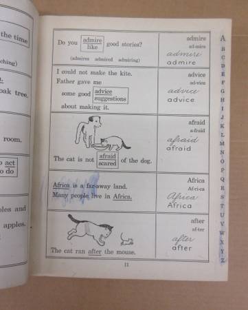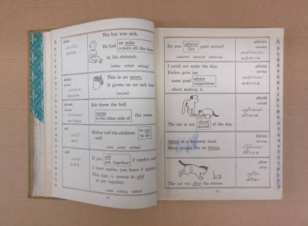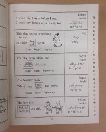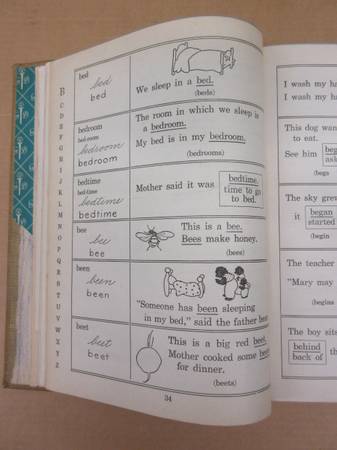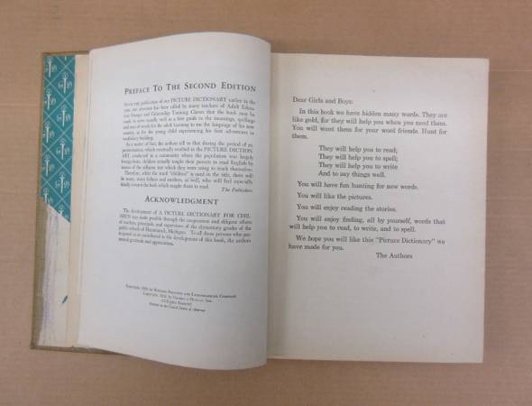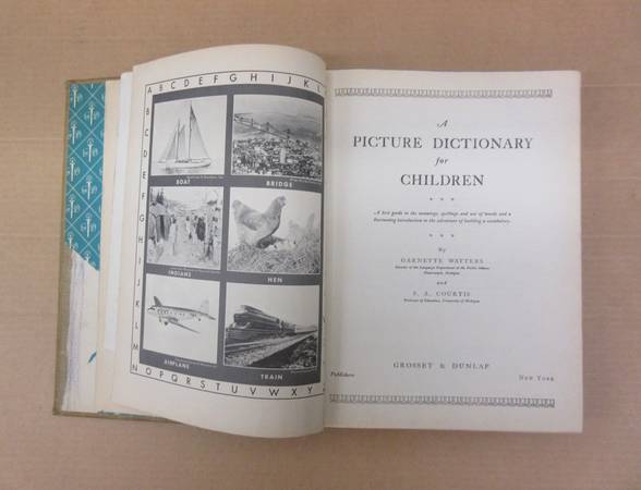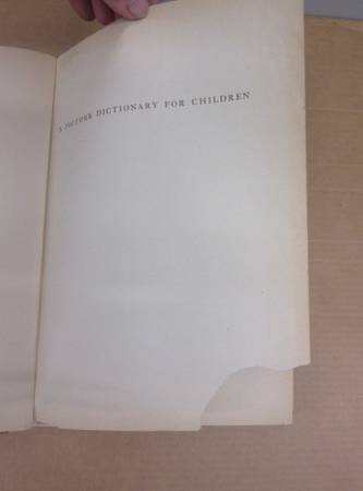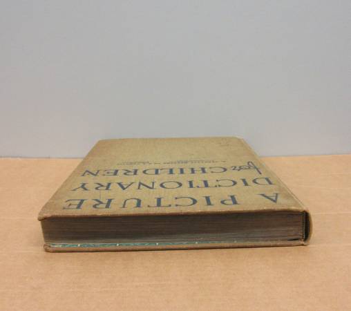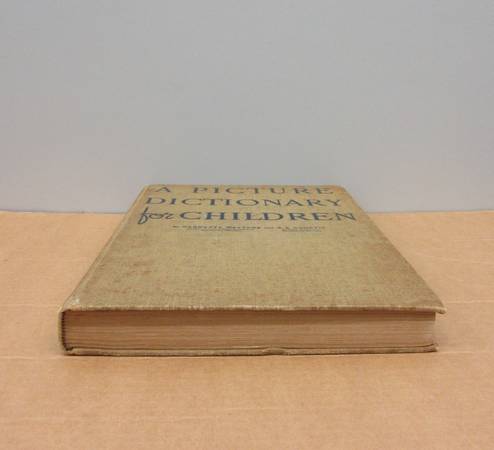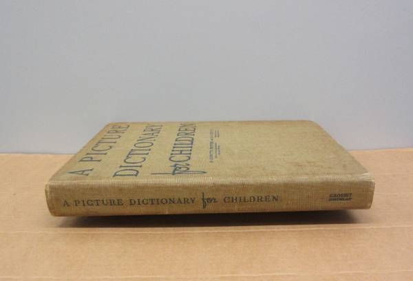 This is a vintage hardcover copy of “A Picture Dictionary for Children”, Garnette Watters and S.A. Courtis, published by Grosset & Dunlap, 1939. It is in excellent vintage condition. The spine is intact. There is minor coloring on one page and pencil underlining on two pages which were erased; the other pages are clean. The cover paper on the inside cover is missing on a small section. Please view the photographs for documentation. The book dimensions are 11 ½” x 8 ¾” x 1 ¼”. Please contact me in you have any questions.