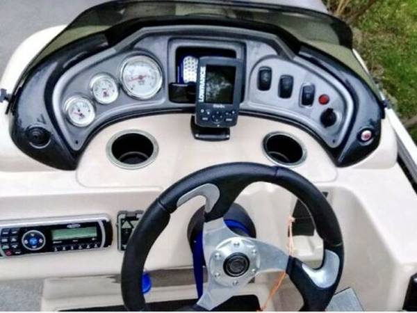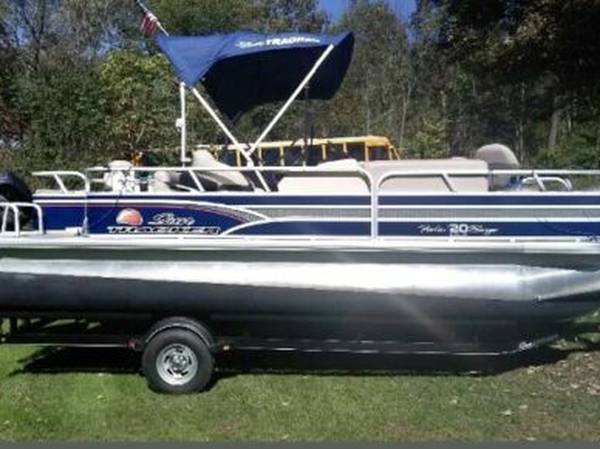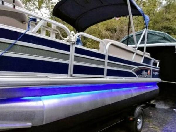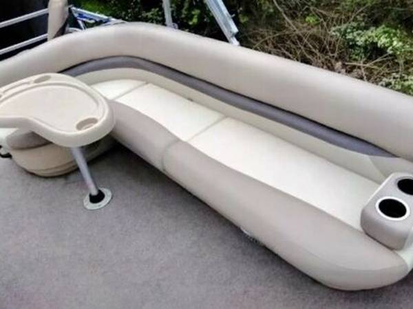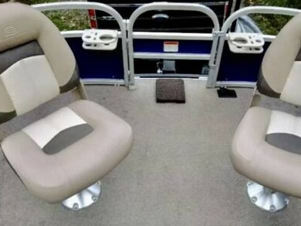 2015 Sun Tracker 20 DLX fishing barge. It is 20 feet long and rated for about ten people. The boat has a 60 HP Mercury EFI four-stroke with a four-blade prop. It has only around 83 hours on it. It was stored indoors most of its life and stayed outside only when it was on the water. It was serviced recently and taken out once this season. It runs quiet and doesn’t use much fuel.