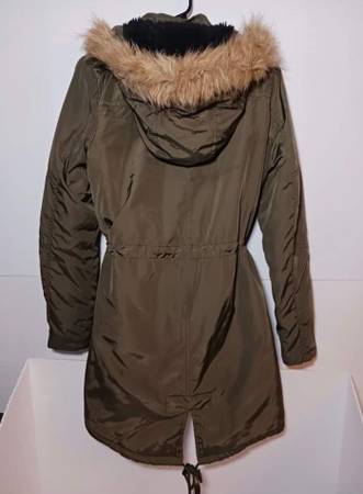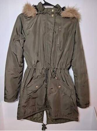 Womens olive green Mossimo winter coat, size Small, full zipper and snaps, drawstring at the waist, removable faux fur hood, longer length to keep the wind out. I can meet in Bondurant, Altoona or Ankeny depending on the day.