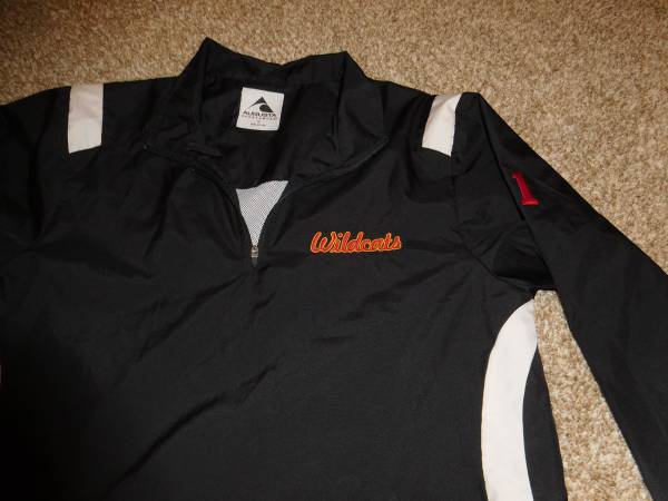 Black Windbreaker and white accents and "Wildcats" on the left chest and the number 1 on the left arm. Great condition. Augusta Sportswear Size Adult Small.