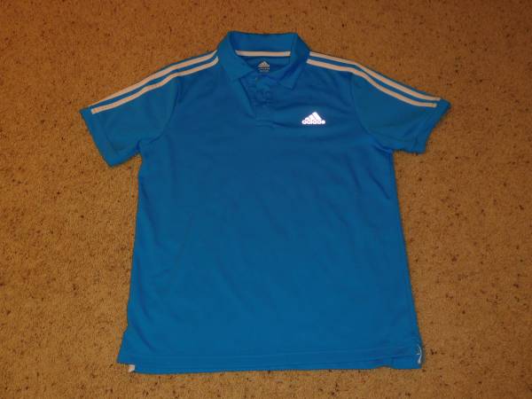 Boys size Large (14/16) Teal Blue Polo Shirt with white stripes and Adidas on the front. Excellent Condition.