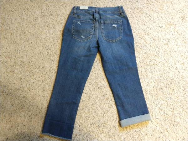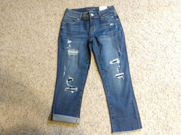 I have a pair of NEW with tags ladies size 0 Maurices mid-rise crop jeans for sale. They are super cute cuffed or left down. All of the holes / rips have patches. Would be cute tucked into boots...