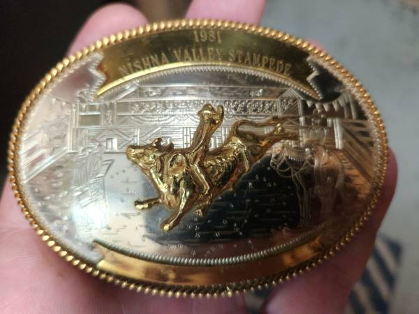 1981 Nishna Valley Stampede Rodeo buckle. Made with german silver by Montana Silversmiths. Rider on bull with rope trim. In excellent condition.$100