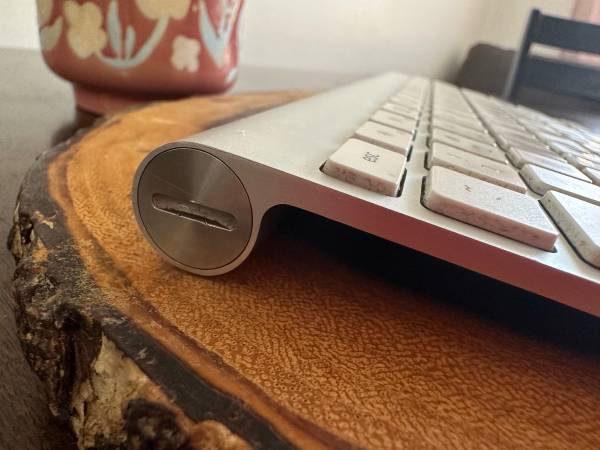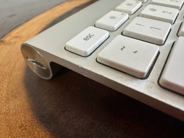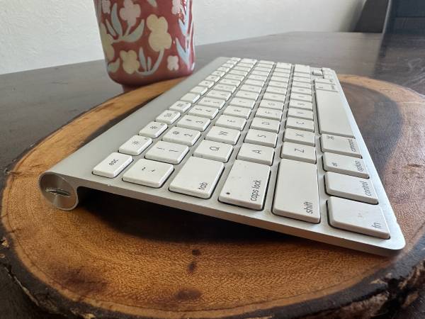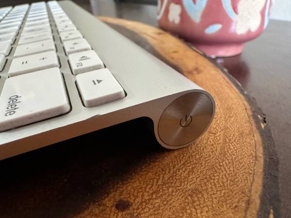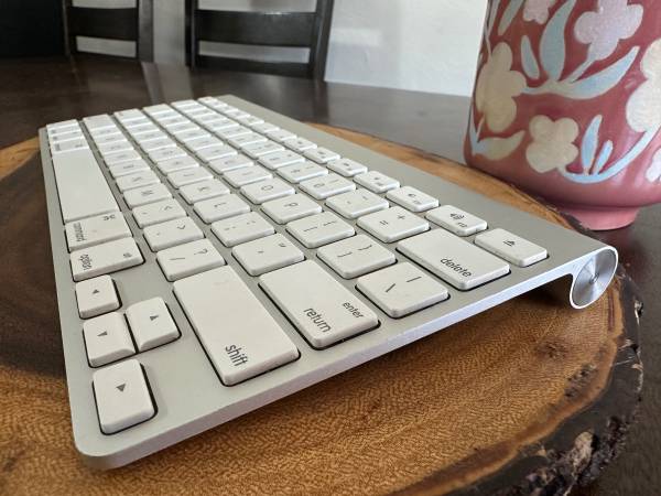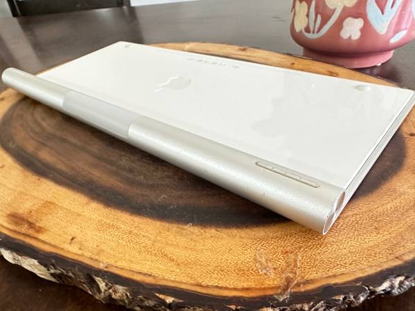 • Design: It features a slim profile with a QWERTY layout, constructed from white plastic keys and an anodized aluminum finish.