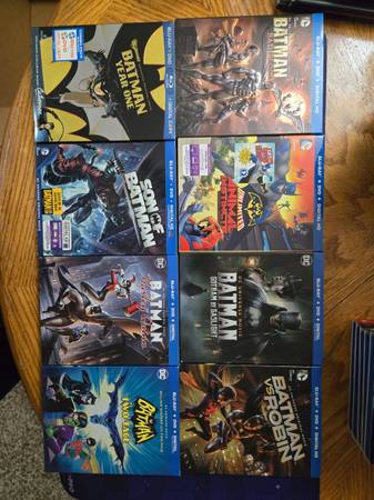 There are 44 movies in total. Mixture of DC superheros. A lot of Batman movies. Wanting to sell as a whole collection. Some notable ones in there worth a bit are Green Lantern First Flight, Justice League Crisis On Two Earths, and Justice League The New Frontier Commemorative edition in metal case. They all still have the slip covers on them. Asking $450 obo Must pick up in Grinnell. Willing to sell individually as well if you are buying more than one. Just shoot me an offer on what you would want.