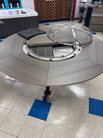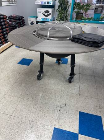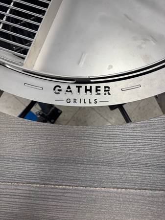 Gather Grills, outdoor fire pit and grill. Uses logs or charcoal. Casters for rolling it away from house, into yard or around patio. 1/2 skillet, 1/2 grates, lazy susan spins for serving or grilling around the table. Adjustable height for chairs or counter top seating around it. Tailgater size. Table around pit is removable. Has cover and wire mesh spark/food cover.