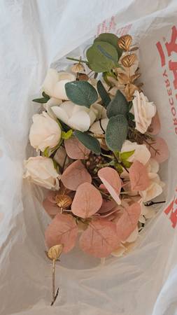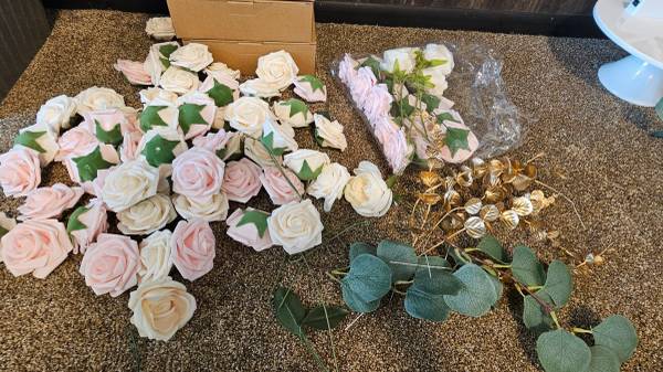 Bag of pink and ivory flowers $10 30 (90 in) ivory Round table cloths and 5 (6ft) ivory rectangle $240 29 gold amber candle holders $25 21 tall candle sticks $20 1 heart led sign $8 White cake stand...