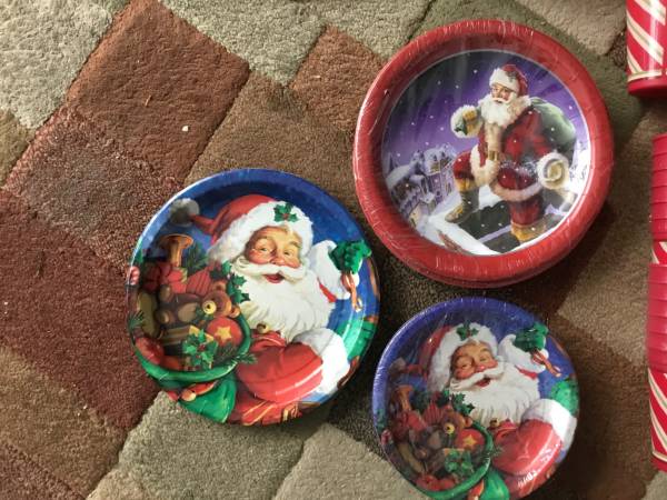 2 Unopened packs of 10 each, 8.75” diameter. Santa on roof. $4