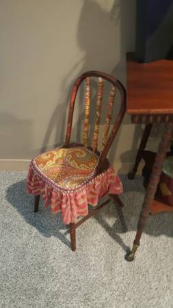 I have a nice little childs chair - that was (refurbished) re-upholstered by an ARTIST - in Fort Scott, Kansas. I don't need it any more - looks nice! It is 27 inches tall and it is 14 inches to the top seat and 13 inches wide at the seat. - This piece is a very old chair in good vintage condition - and reinforced here and there - and upholstered to look very BOHO STYLE! Very used... and has wear.... but a cute - display chair too even if you don't have a small child - and can put a doll or teddy bear in it... like I have for YEARS.