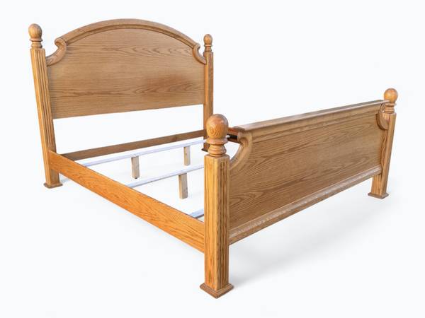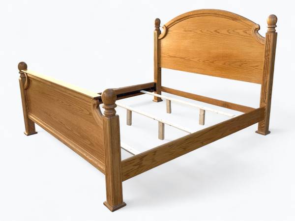 • [Features]: Four-post bed design with turned finials; Fluting on base of posts; Arched Edges; Curved headboard; Metal inner bed slat rails; 3 bed slats with double vertical support legs and adjustable glides; Bracket Feet; Solid and heavy construction
