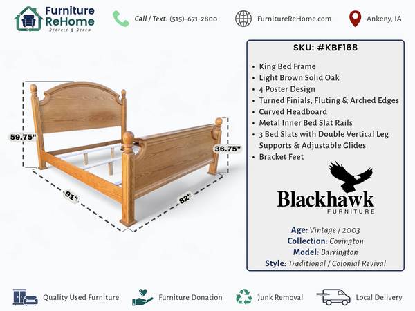 - Frame: 82” Length X 91” Depth X 59.75” Height (top of headboard) / 36.75” Height (top of footboard)
