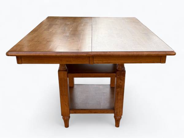 • [Features]: Storage base with 2-tier shelves; Table has beveled edges and turned legs; Self-storing butterfly table leaf with leaf locks; Slat-back chairs with footrests