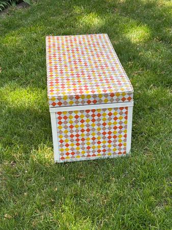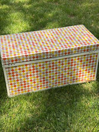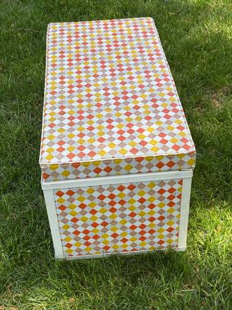Groovy vintage chest. 1960s? 1970s? Vinyl is in very good condition. Metal frame has small amount of rust in lower back corner. Clean inside. 30” wide x 15” deep x 14.5” high.