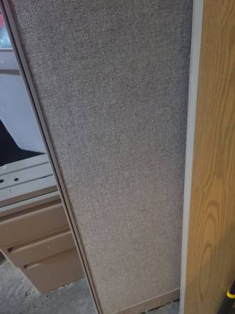 Cubicle walls, 2 desk tops, 2 floor cabinets. I don't have a picture of it all set up, but including a similar set (no upper shelf), the other pic shows the colors (tan cabinet, neutral gray walls, wood-grain desktop. All in good shape. It was originally set up for 2 elementary kid's individual in-home school study desks.