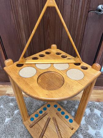 Corner Pool Cue wood stand plus triangle rack for sale. Provides optimal storage option for up to 10 pool cues and 1 set of pool balls. Also includes 4 cork insets for drink placement. The styling of the corner rack saves lots of space for storing your pool table equipment. Great price for a stand and rack in excellent condition.