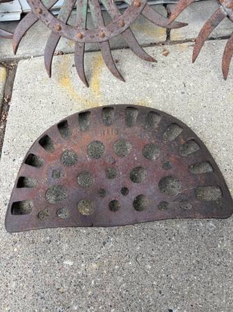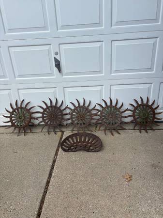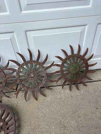 Five John Deere 18" Rotary Hoe Wheel and one cast iron seat. Please check all photos for more details. Price is for all five wheel and one seat. show contact info