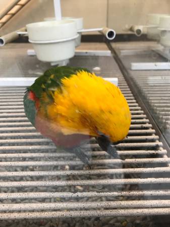 Sun Conure there will be a "rehoming fee" to make sure he goes to a good home. I just do not have enough time to play with him. He is a male and he has his DNA papers. His name is Za Zu and is 7 yrs old.