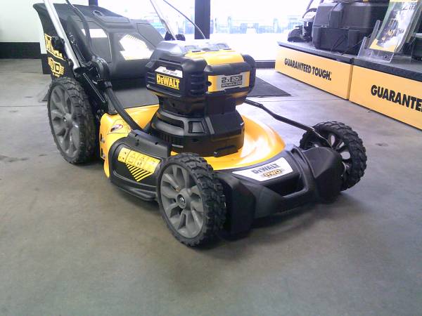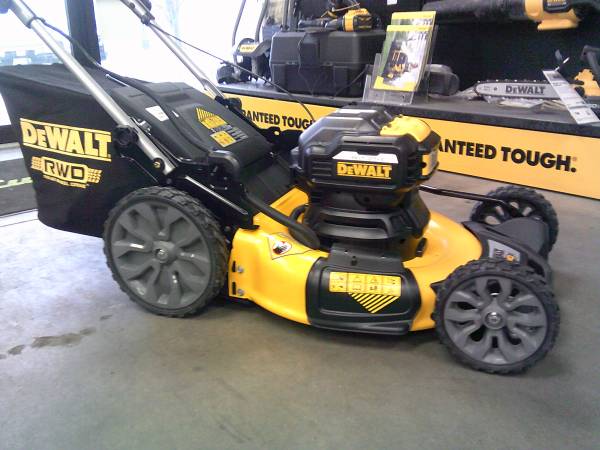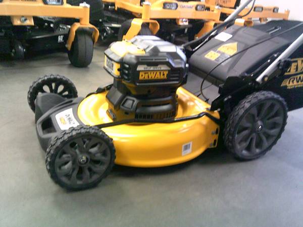 The DeWalt 2X 20V MAX self-propelled lawn mower features a battery-powered brushless motor with electric push button start and no pulling necessary. This model features a collapsible handle for easy storage. The deck allows for cutting height adjustments ranging from 1.5 to 4 inches tall. This model is a self-propelled, rear wheel drive mower.