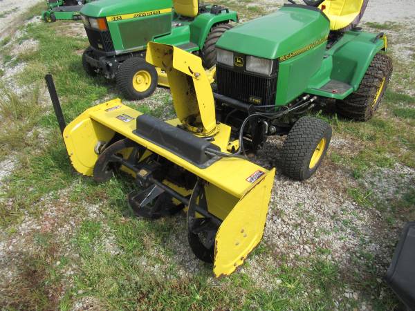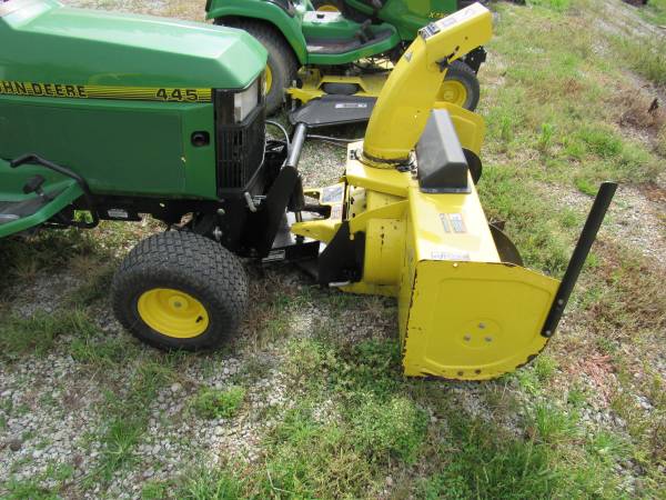 Very nice JD 445 with only 838 hours on the Kawasaki 22 HP Liquid Cooled Engine. Has foot operated hydro trans, diff lock, P.S, tilt wheel, hydraulic lift with remotes for front attachments that I have for sale. Comes with a 54" deck that has a mulch kit on it, 47" front two stage snow blower, weights and chains I have attachments for sale like front broom, or blade, call if you need a package price with some of the attachments. I also have a 455 with 60" deck and 54" front blade for sale. Click on MORE ADDS BY THIS USER to see other equipment that I have for sale.