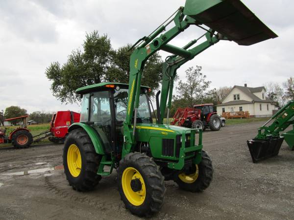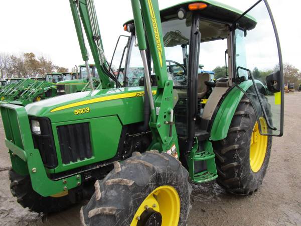 2008 John Deere 5603 tractor, 4wd, only 1228 actual hours, 99 horsepower, 12 speed transmission w/ LH power reverser, 3 point hitch, 1 rear hydraulic remote, 540 & 540E pto, cab, air, heat, diff lock, grill guard, original Goodyear tires, rear 18.4x30 @90%, front 12.4x24 @65%. Comes with a John Deere 542 loader with joystick, mid valve and 6' quick attach bucket. All original paint except for the loader bucket. Pre-Emissions. No DEF. No Re-Gen. Super nice tractor, excellent condition. $52,500. Trades welcome. Financing and delivery available. Lots of tractors and equipment at bnttractor.com
