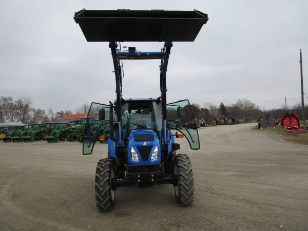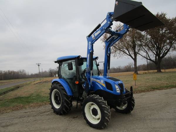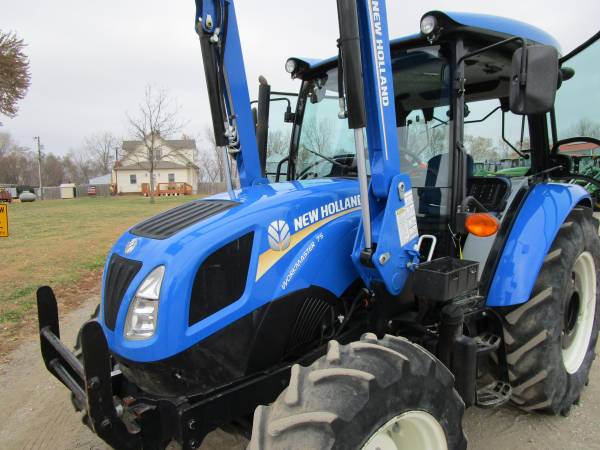 2020 New Holland Workmaster 75 tractor, 4wd, only 492 hours, 75 horsepower, 12 speed transmission w/ LH power shuttle, 3 point hitch, 2 rear hydraulic remotes, 540 pto, cab, air, heat, stereo, air seat, buddy seat, rear wiper, sun roof, diff lock, grill guard, rear wheel weights, rear tires 16.9x30 @90%, front 11.2x24 @70%. Comes with a New Holland 550LU loader with joystick, mid valve and 6' skid steer quick attach bucket. No DEF. Nice tractor, excellent condition. $39,900. Trades welcome. Financing and delivery available. Lots of tractors and equipment at bnttractor.com