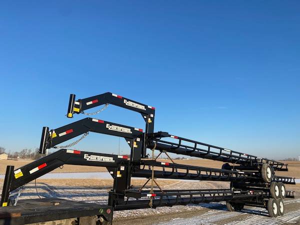 EZ Haul In-line self dump Bale Trailers, Manual Dump. Double locking safety system. Ez haul has been in the business making these trailers for many years. You can be sure to have many years of trouble free use and reliability. Main Pipe is 3/8 Inch thick wall. Frames made of 3 x 5 tubing. Double latch locking system released easily with the unload arm.