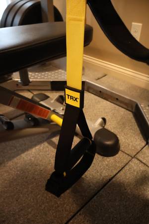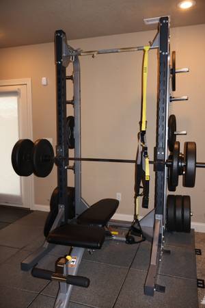 Hammer Strength weight lifting system in excellent condition that includes a half rack, bumper weights, Olympic bar, incline bench, TRX suspension trainer and heavy duty interlocking flooring.