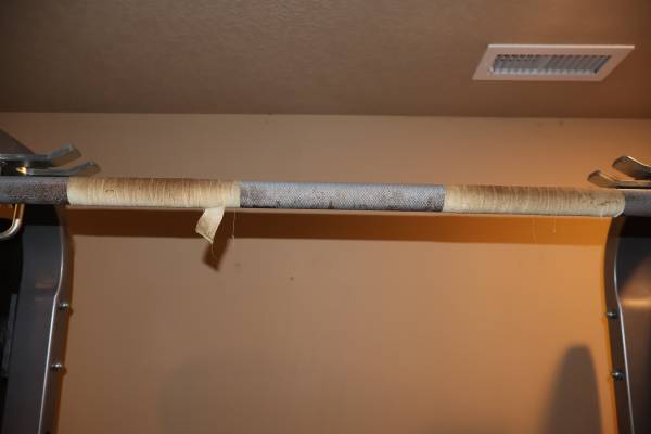 Half rack measures 55"L x 4'W x 8'H. Includes pull-up straight bar, side upper hooks, Olympic bar and bull horns for plate storage.
