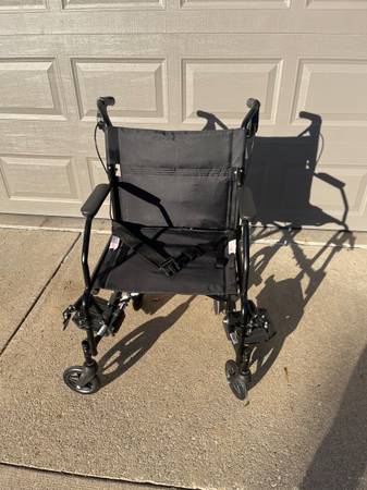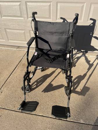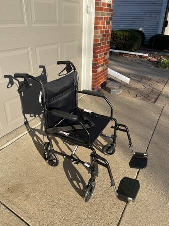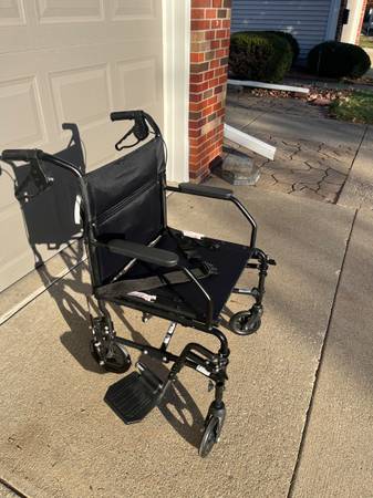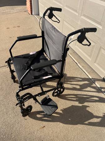 Transport Chair Equate brand 19"wide 300 lb capacity 8" wheels , seatbelt dual manual handbrakes and parking brakes footrests detachable and lock in place when not in use Like new $65 Please call us...