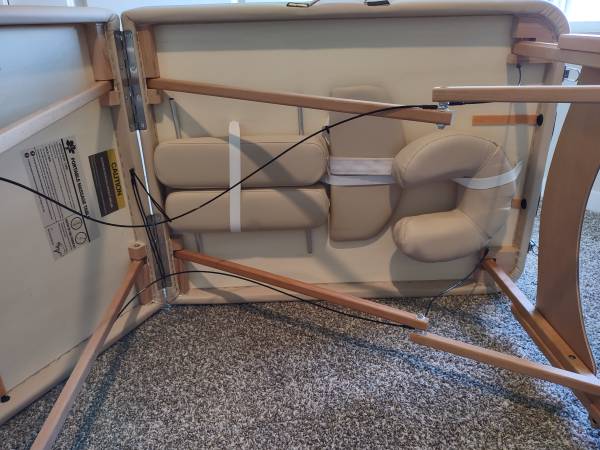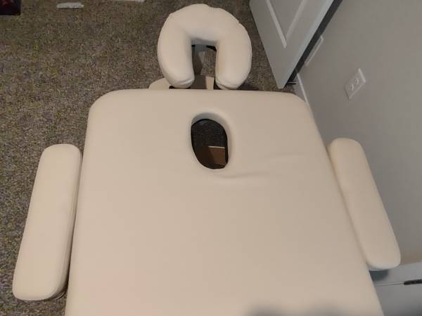 This massage table was only used a handful of times and is in like new condition. The massage table includes an adjustable headrest and pillow, arm rest, and arm extensions.