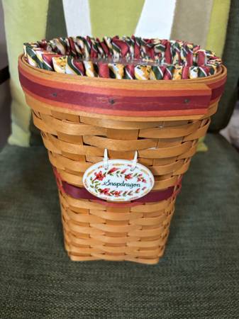 Vintage 1998 Longaberger May Series Snapdragon Basket with 2 piece Protector, Liner and Tie On (Set of Three). Excellent used condition. No damage. Liner is in excellent shape. I am selling as used but, only used on display. $30 you don't see this basket very often - for sure!