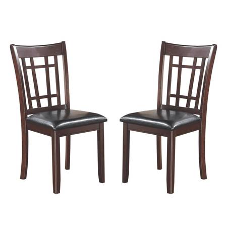 Sturdy, functional dining chair is part of the transitional Lavon Collection. Back rest features wood styling in rectangular design. Slightly flared back legs and back rest and with straight front legs enhance a silhouette that's half pragmatic, half eclectic. Rich espresso finish and black faux leather seat are aesthetically pleasing. Consummate complement to matching dining table.