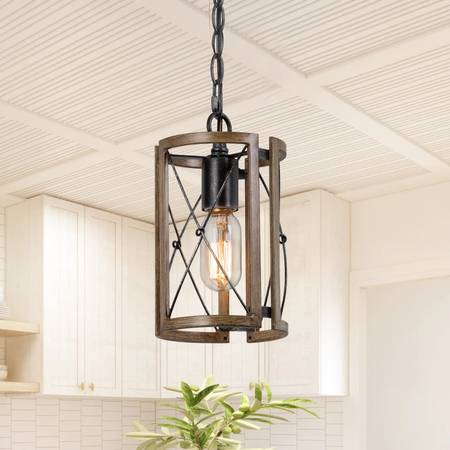 Bring a touch of rustic charm to your modern decor with our Modern Farmhouse Cylinder Wood Metal Small Pendant Industrial Cage Kitchen Island Lights. The vintage brown finish of the rustic metal and wood panels beautifully blends to create an upscale vibe that is perfect for your kitchen island or dining room. With the ability to be mounted on a slanted or sloped ceiling, this pendant offers versatility in placement, and the DIY option lets you experiment and have more fun with the hanging length of multiple pendants.